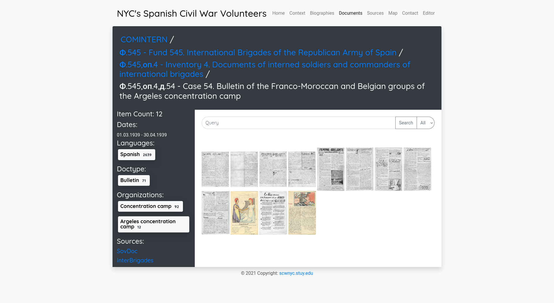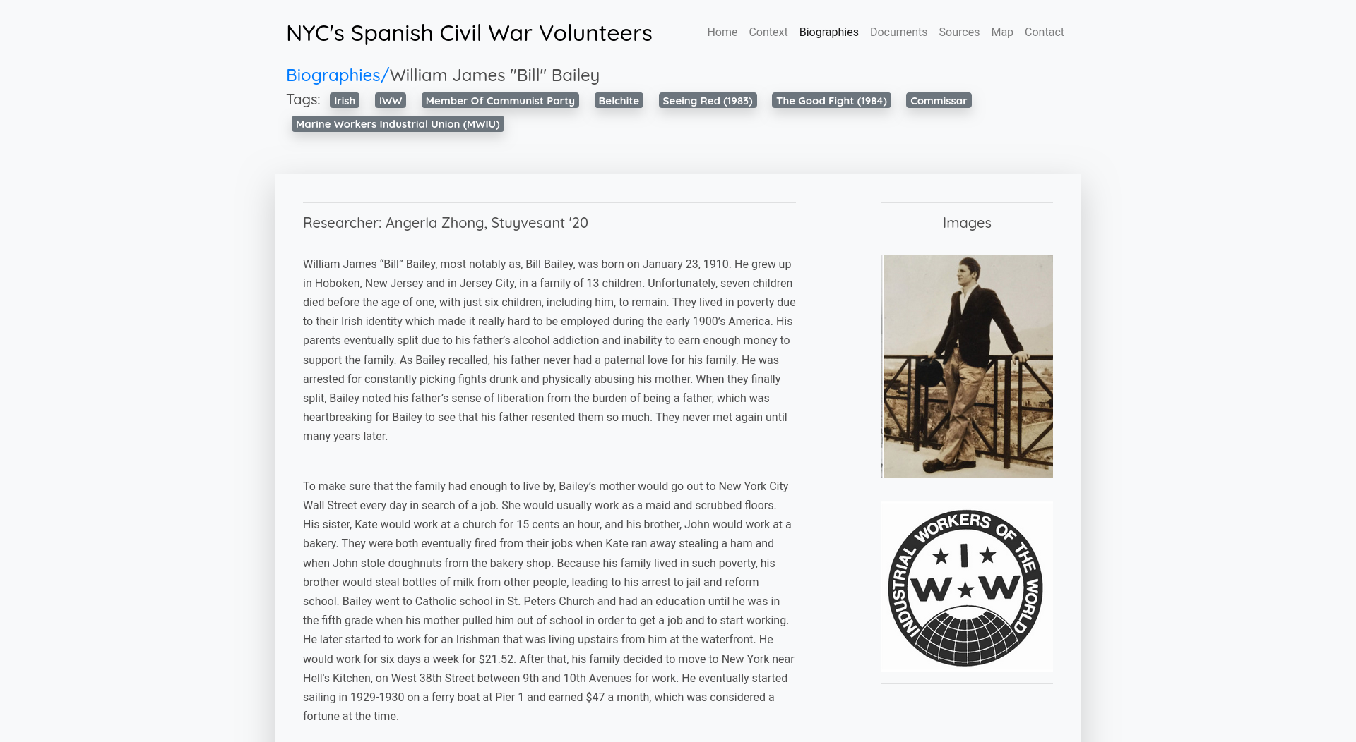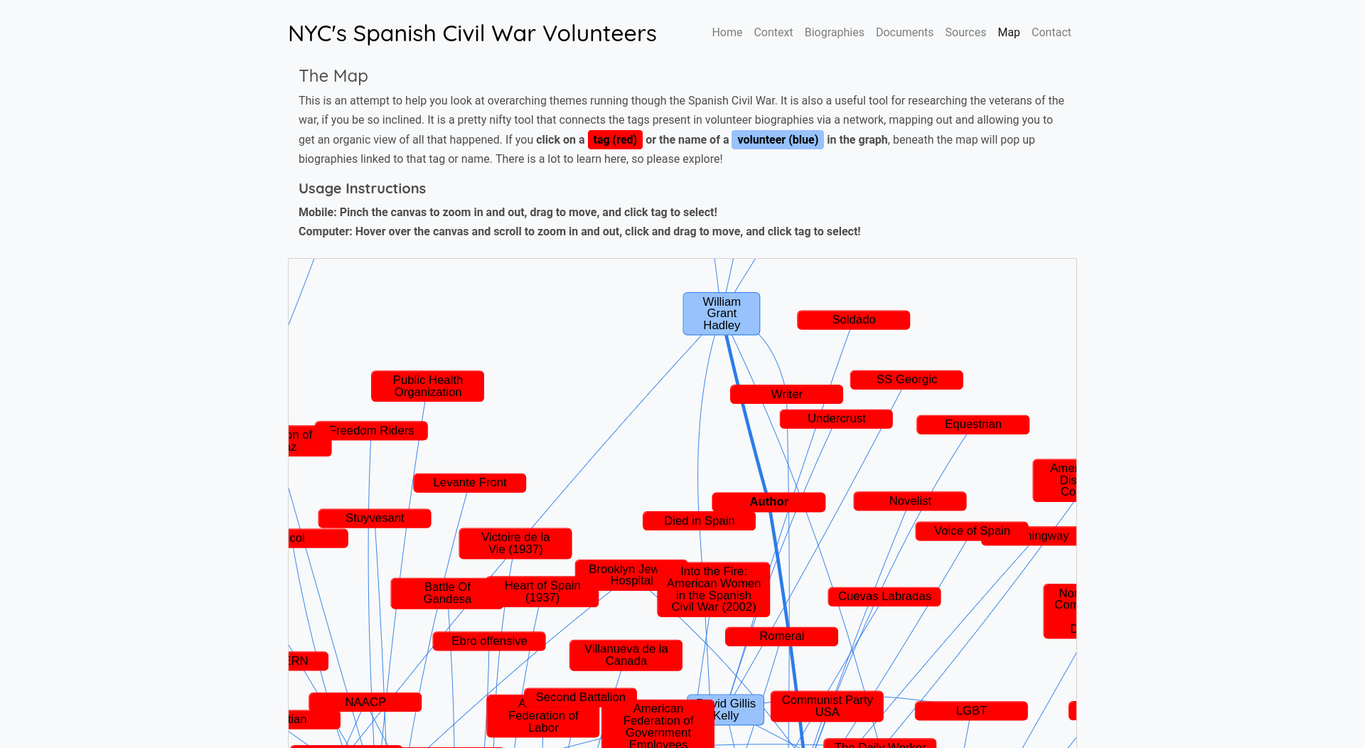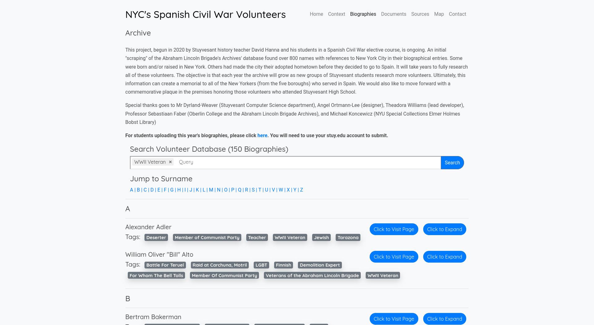 A few years ago, I created the website scwnyc.stuy.edu for the Stuyvesant High School History Department, and I maintain it to this day. The site primarily serves as a repository of student research into New Yorkers who fought fascism during the Spanish Civil War, complete with content tagging and advanced search capabilities. It also contains the first English-language interface for navigating the COMINTERN archives relating to the war (which had only been in Russian until then). I’m quite proud of it, as it runs on an annual budget of $0 and has a fairly complex home-brewed CMS!