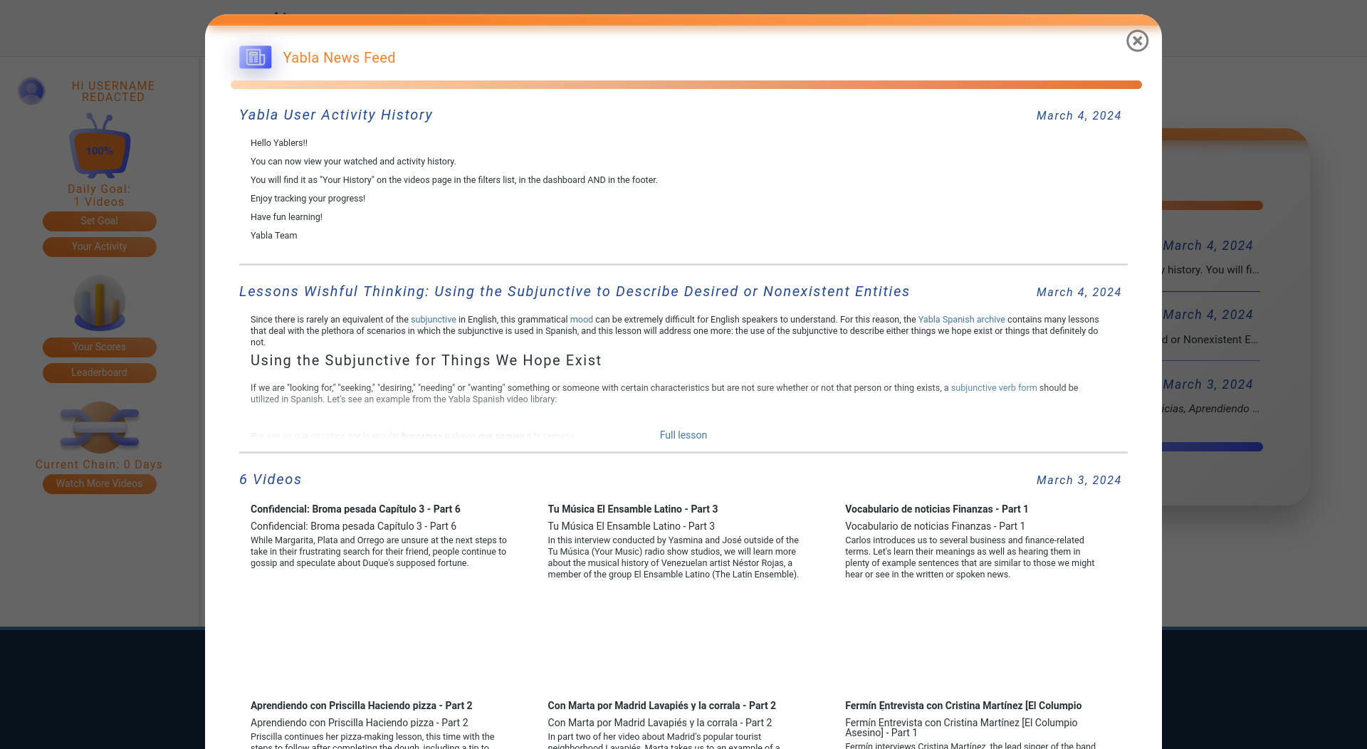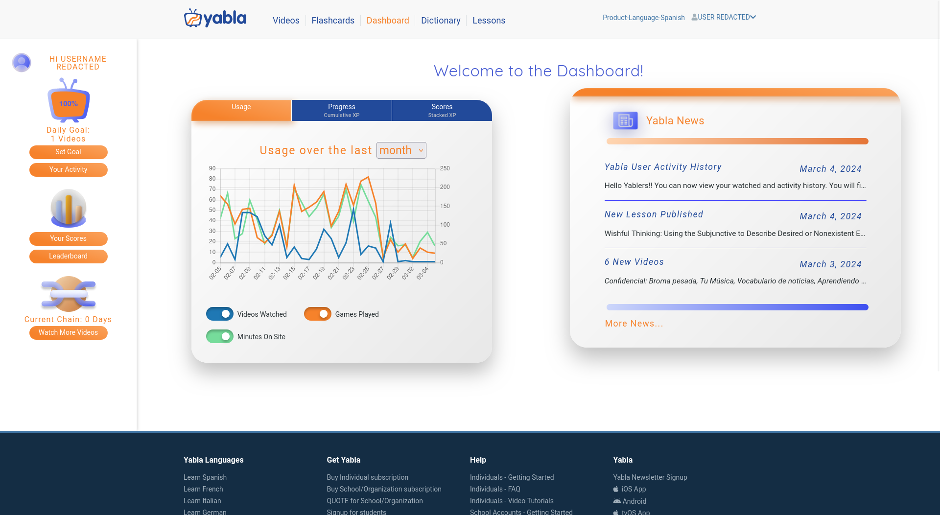 I worked for Yabla, a language immersion platform, as a full-stack software developer for a few years before leaving to finish my education. As a small company, I ended up wearing many hats there and designed various new features for our complex system of users, affiliates, workers, and admins. To highlight some of my favorite projects and larger responsibilities: